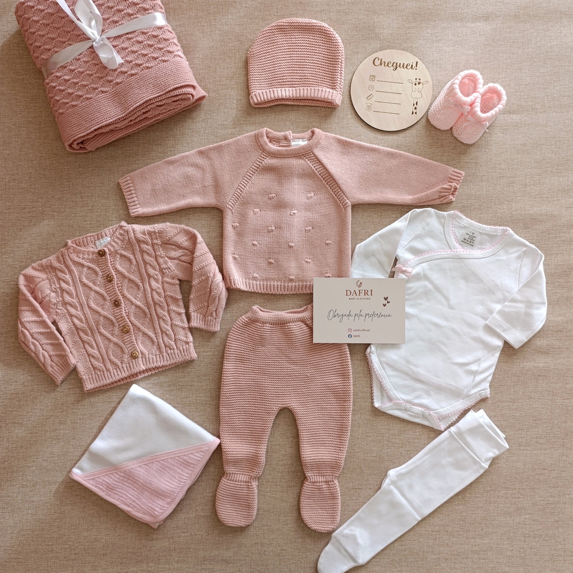 • Conjunto de roupa de bebé rosa e branco com manta, casaco, calças, body, gorro, botins e placa redonda de madeira com texto