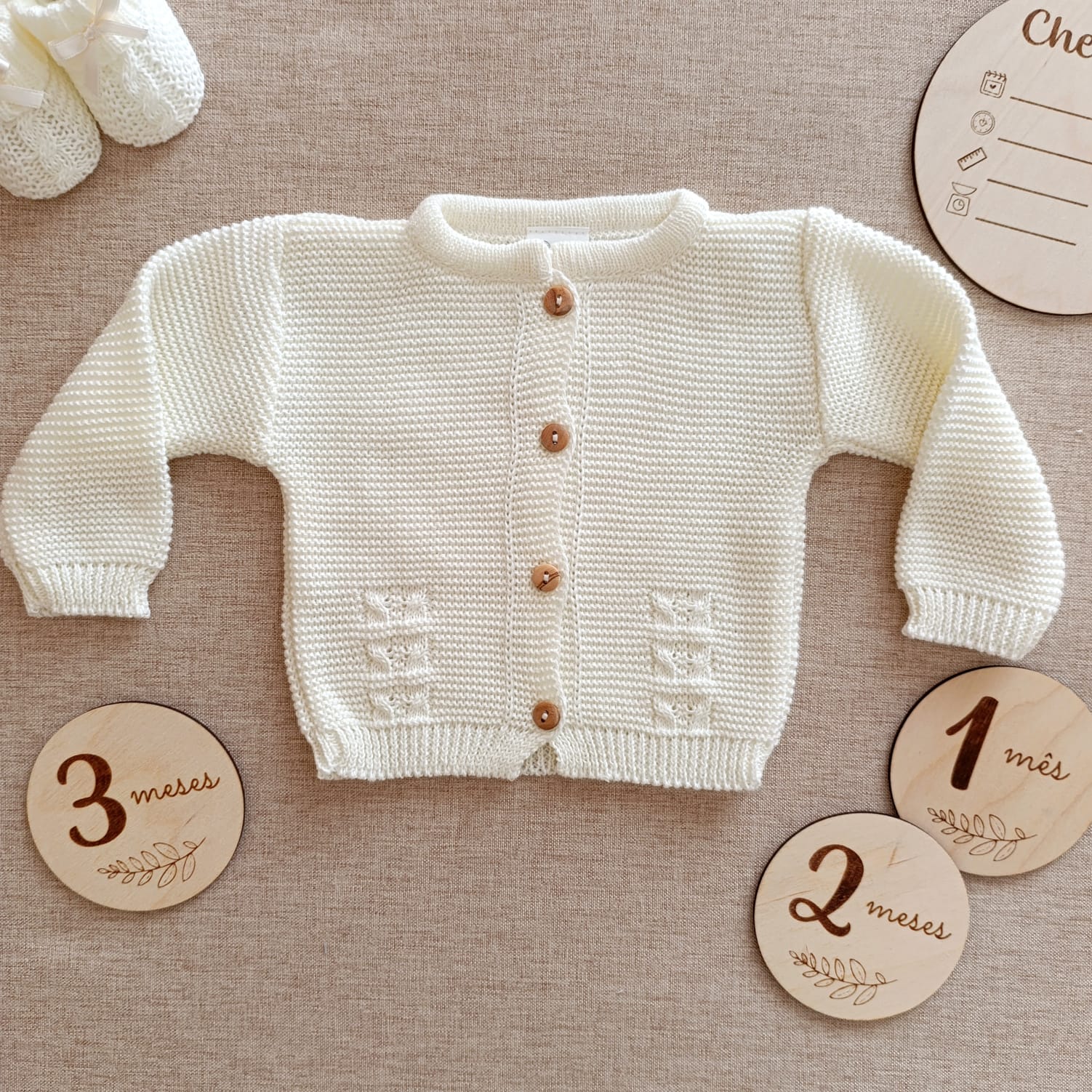 • Casaco branco de malha para bebé com botões de madeira e discos de madeira com meses.