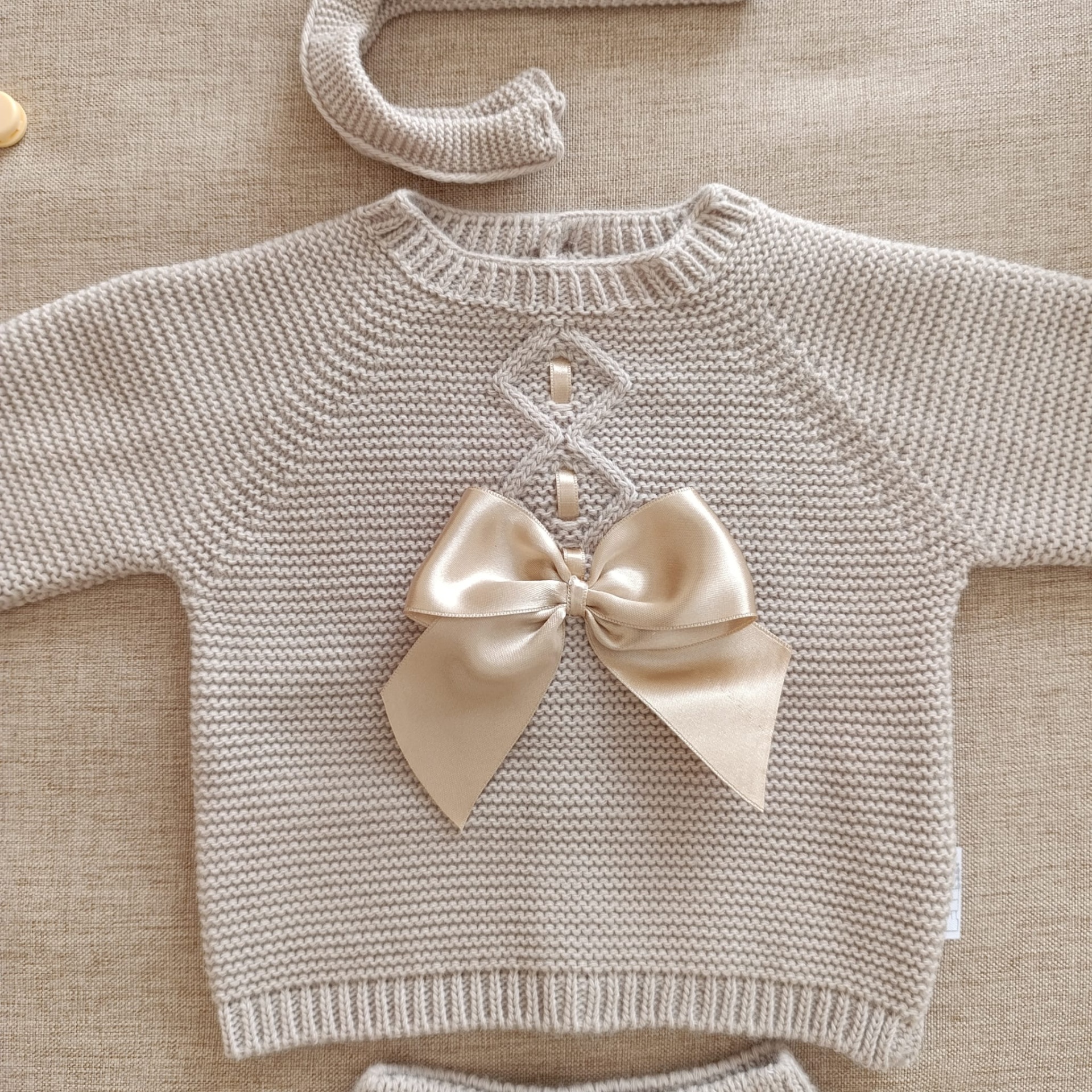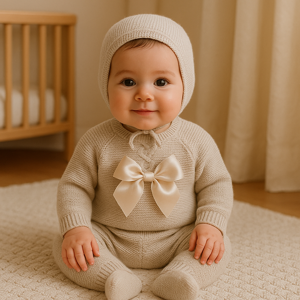 • Bebé sentado com roupa de malha bege e laço de cetim em ambiente confortável