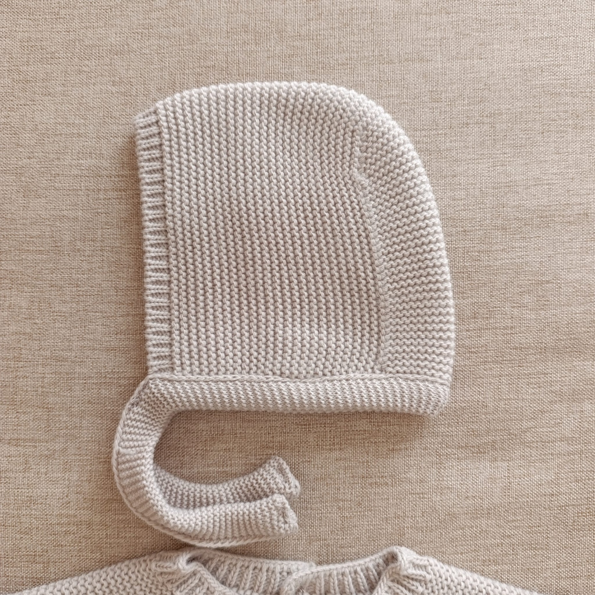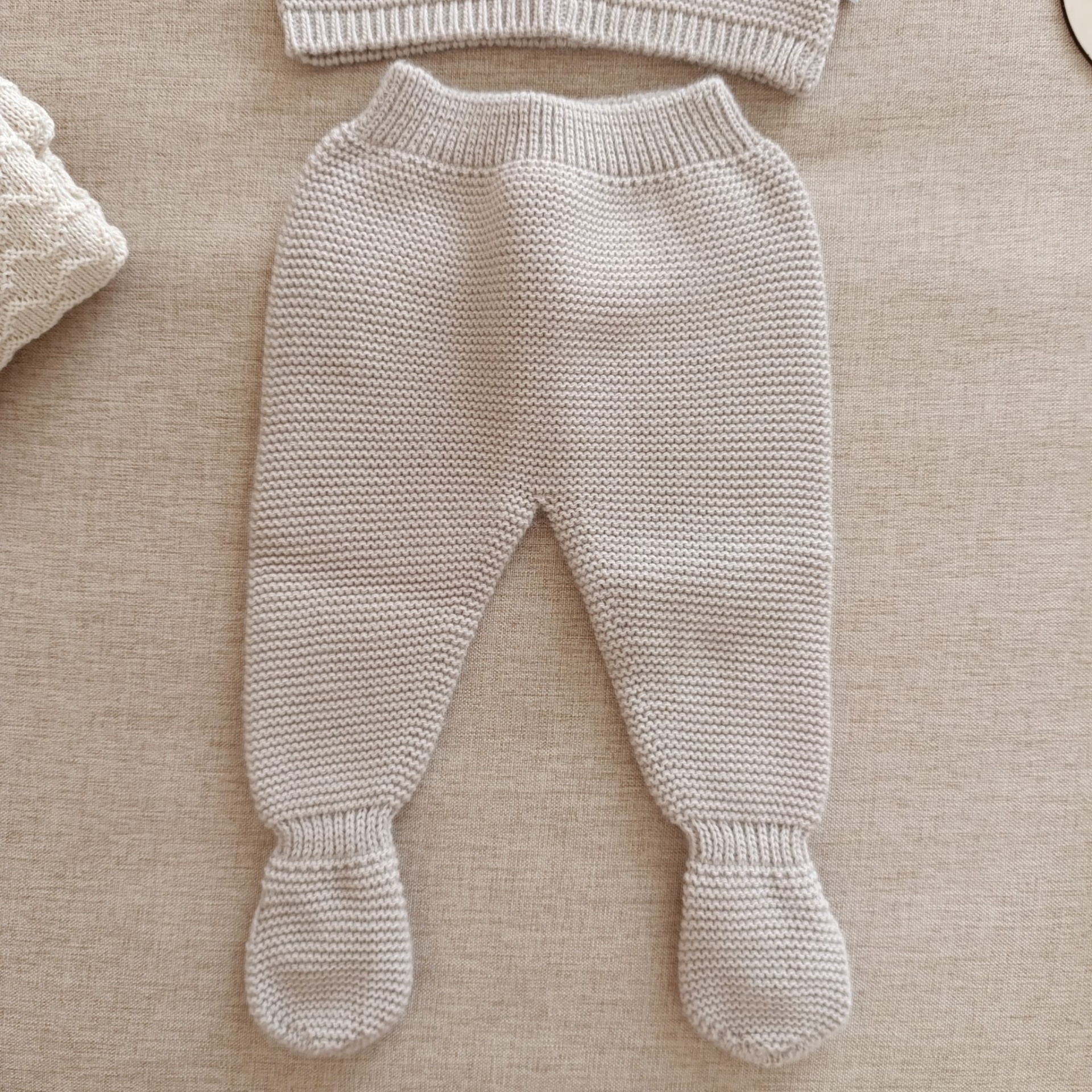 • Conjunto de roupa de bebé em malha cinzenta clara com laço de cetim e acessórios em fundo bege.