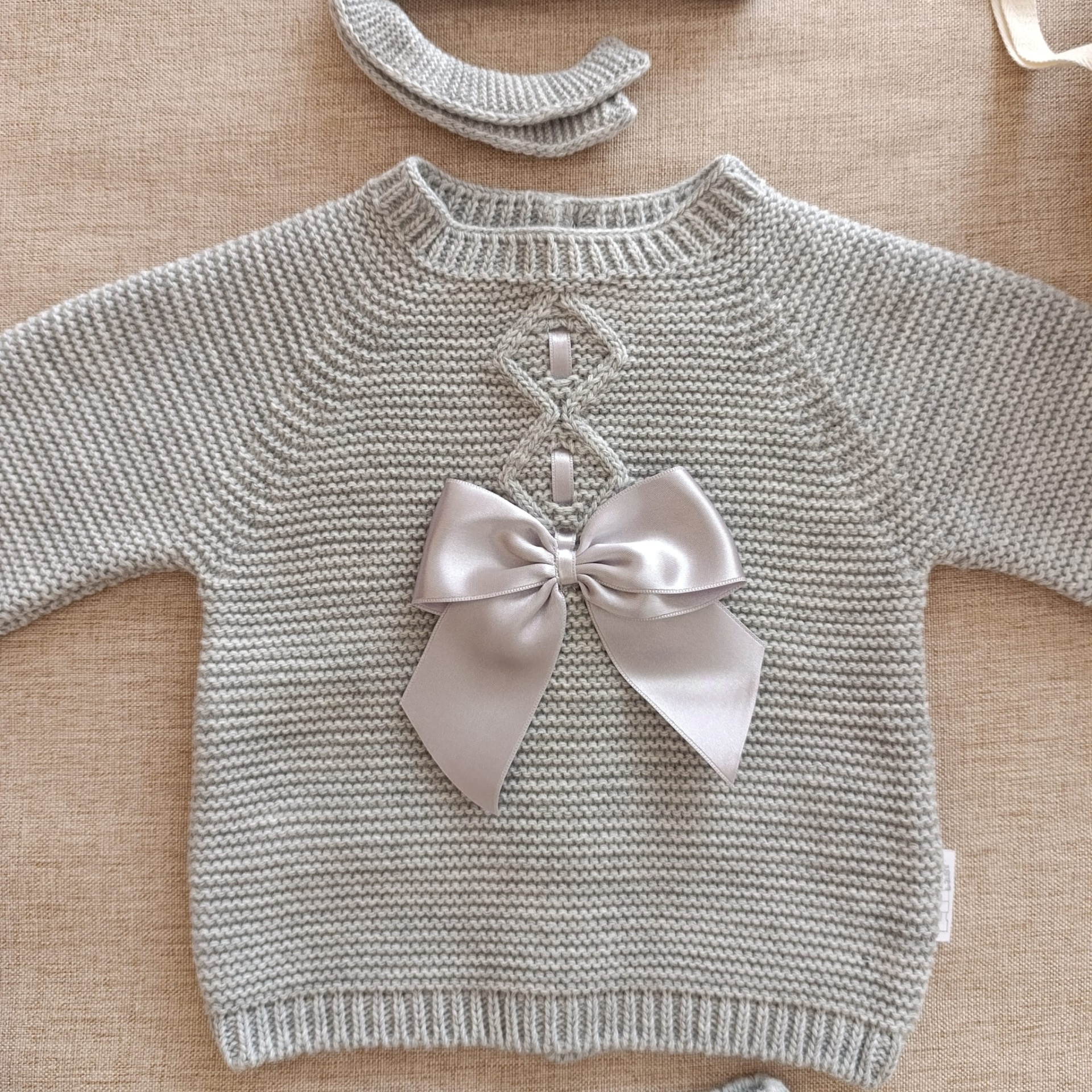 • Suéter de malha cinzenta com laço de cetim cinzento sobre fundo bege.