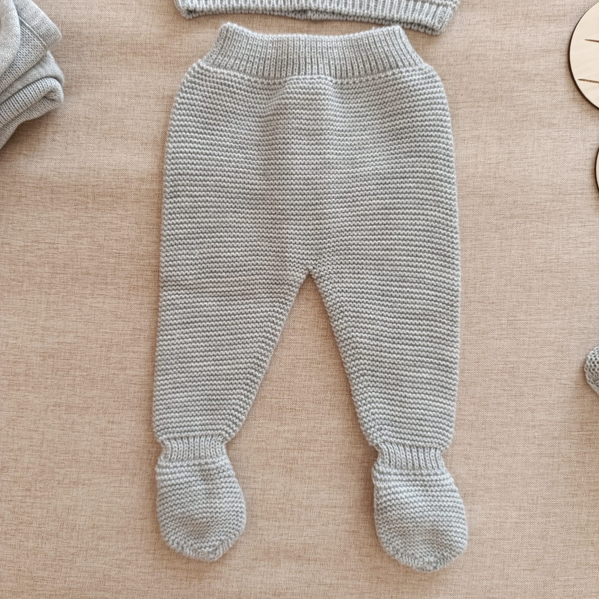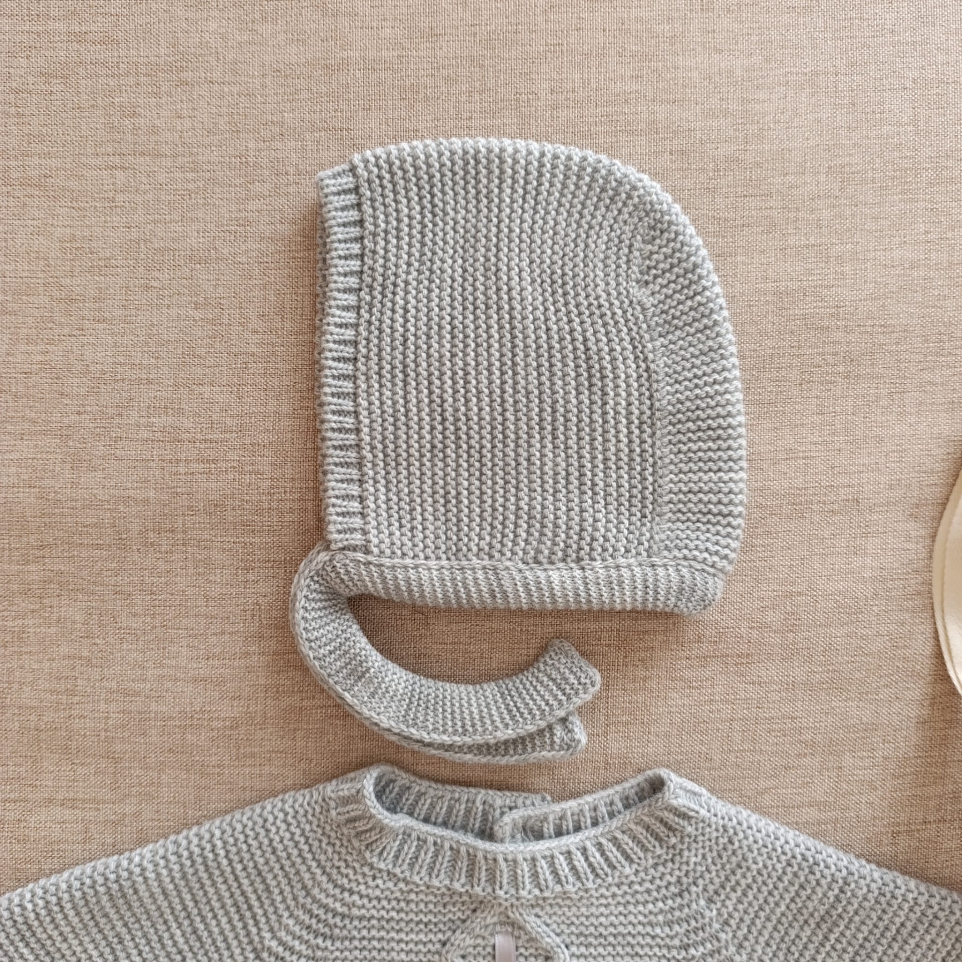 • Gorro de malha cinza claro para bebé com camisola cinza claro em fundo bege.
