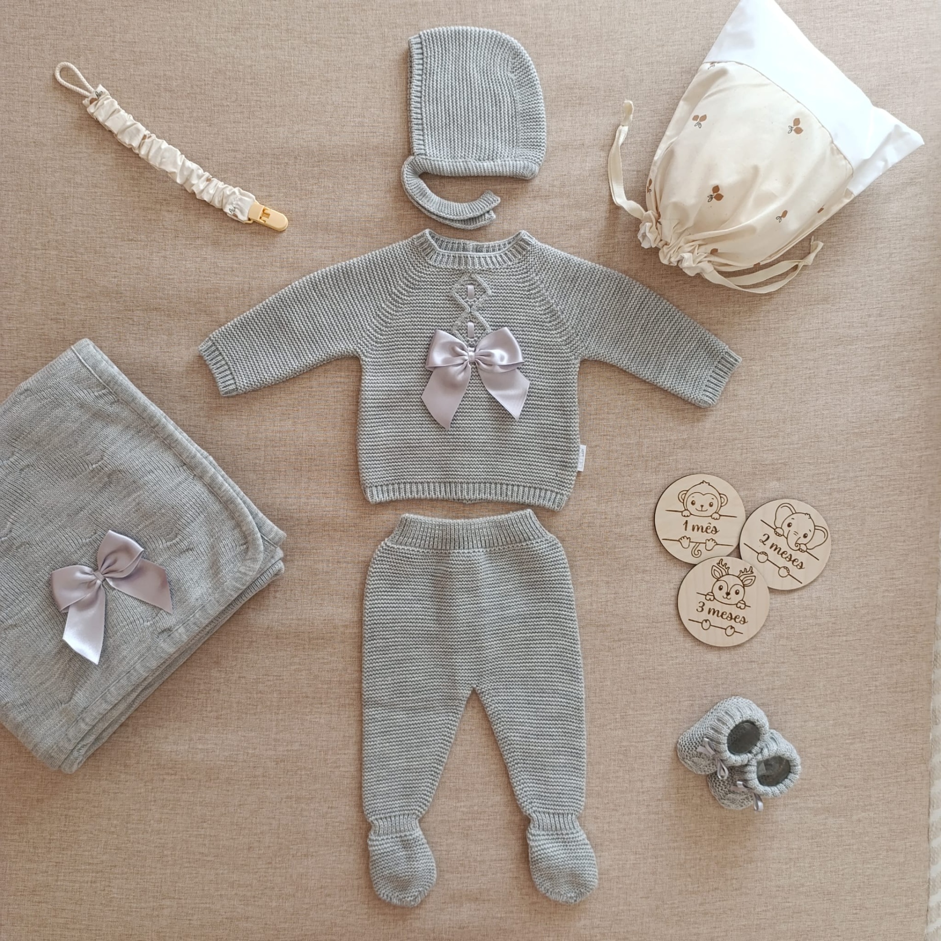 • Conjunto de roupa de bebê cinzenta em malha com laço rosa e acessórios sobre superfície bege