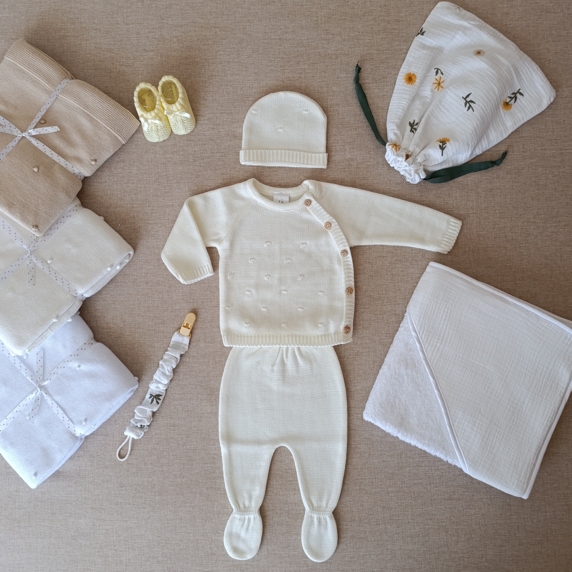 • conjunto de roupa de bebé creme com mantas, sapatinhos e saco com padrão floral
