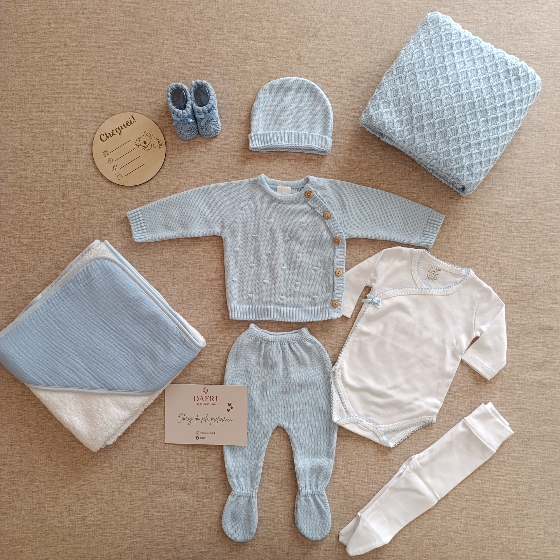 • Conjunto de roupa de bebé azul-claro e branco com acessórios organizados sobre tecido bege.