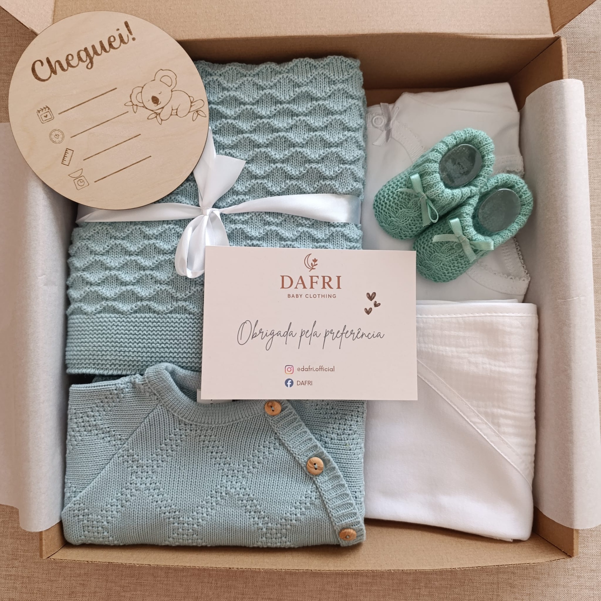 O kit completo é composto por manta, conjunto de malha, body e calças, fralda, carapins e placa “Cheguei!”