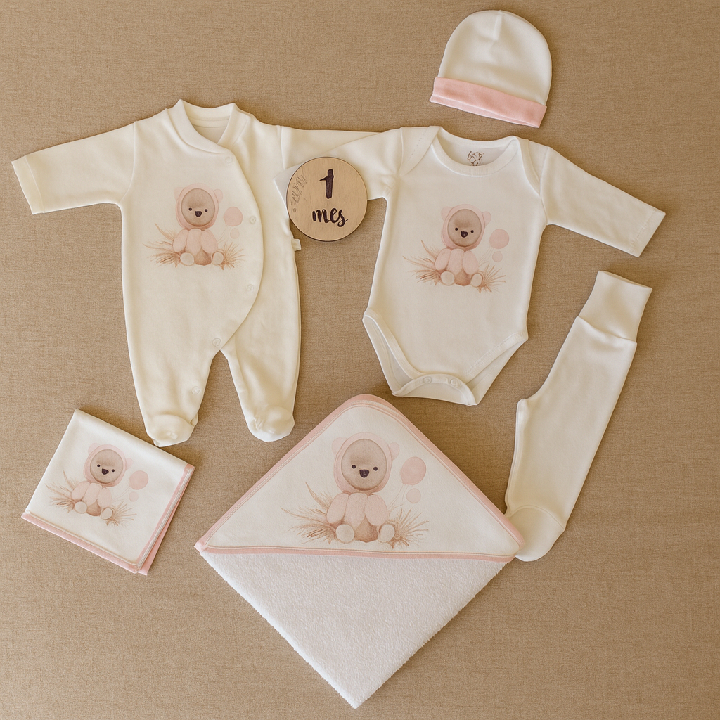 • Conjunto de roupa de bebé creme com padrão de urso rosa e acessórios