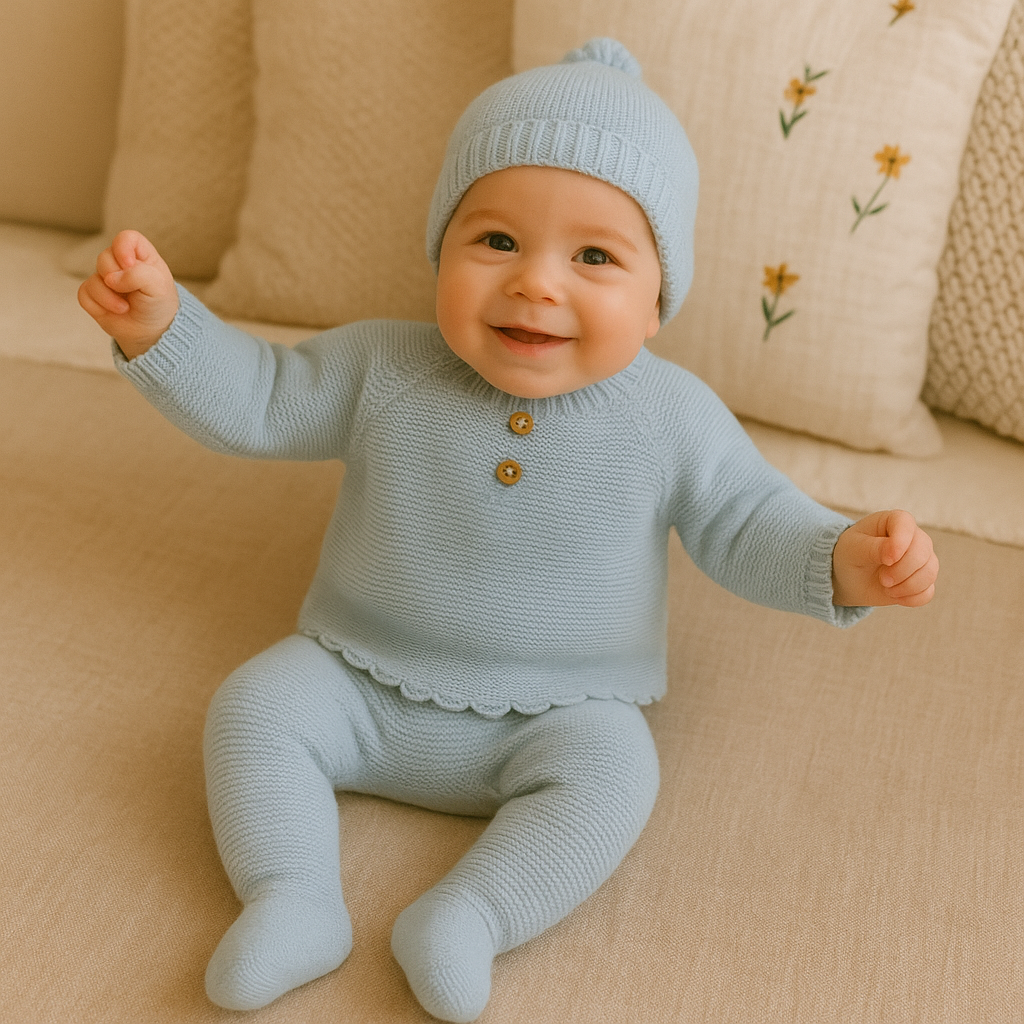 Conjunto de malha botões - Azul claro 19,90 € Desconto de %. Partilhar Compre este artigo e ganhe 19 Pontos! Saber mais Tamanho 0-3 meses Comprar Contactar Conjunto de malha grossa (Outono/Inverno) Cor: azul claro Composição: camisola com abertura nas costas (botões), calças com pés e gorro